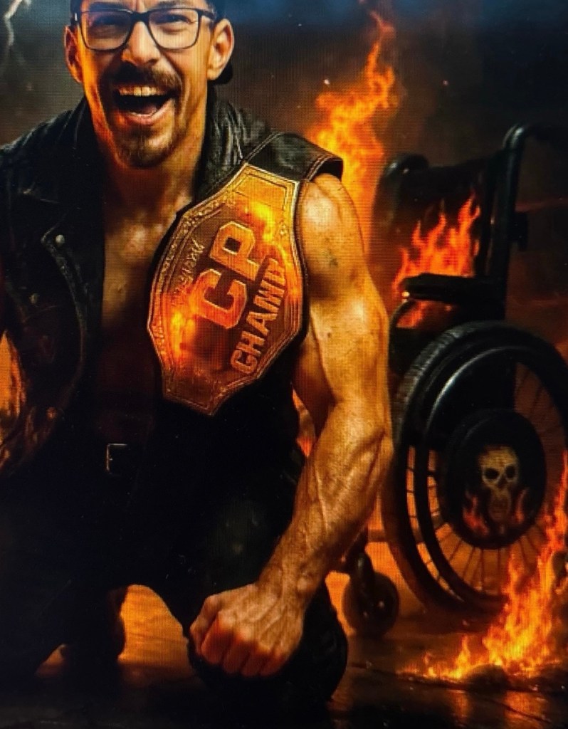He’s a stand-up comedian with material as sharp as his elbows—mostly aimed at life with CP, but nobody is safe. And when the mic drops, he’s talking sports with the best of them: Oilers, Jays, and Chiefs till the day he dies (don’t mention the Bills or Golden Knights unless you’re looking to get roasted).